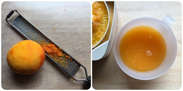 • Zuerst die Schale einer Orange mit einer Zitrusfrüchtereibe abziehen; dann den Saft von 2 Orangen auspressen, bis 200 ml erreicht sind.