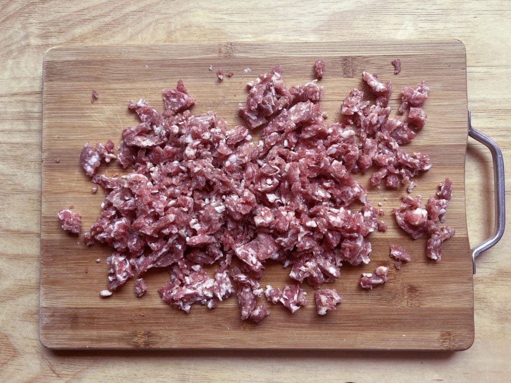 Die Würste von der Pelle befreien und mit einer Gabel zerbröseln.
