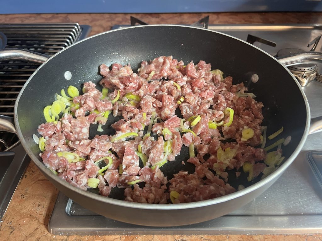 Wenn der Porree leicht weich geworden ist, die Würste hinzufügen.