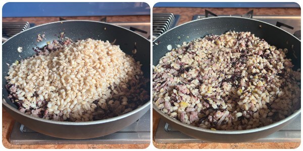In der Zwischenzeit die Gerste in reichlich gesalzenem kochendem Wasser gemäß den Anweisungen auf der Verpackung kochen; abtropfen lassen und direkt in die Pfanne mit der Sauce geben. Umrühren, um alle Zutaten gut zu vermischen.