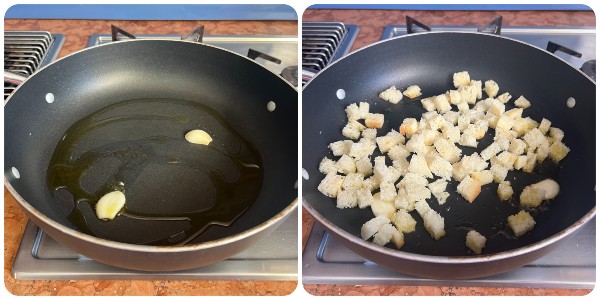 In einem großen Topf einige Esslöffel Öl mit einer geschälten, halbierten Knoblauchzehe ohne den inneren Kern erhitzen. Die Brotwürfel bei starker Hitze unter ständigem Rühren rösten, bis sie goldbraun und knusprig sind. Das dauert ein paar Minuten.