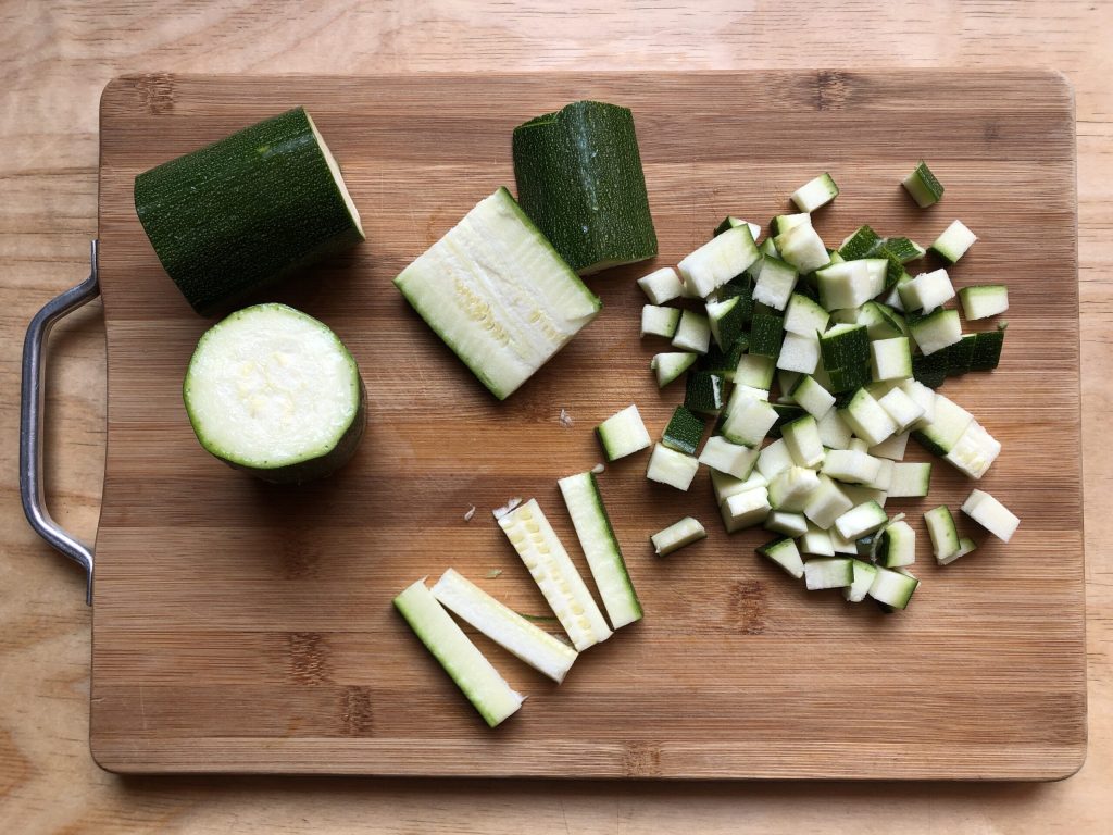 Die Zucchini schälen, waschen und in Würfel schneiden. Ich empfehle, sie zuerst in Stangen zu schneiden, dann in Scheiben und schließlich in Stäbchen, aus denen Sie leicht Würfelchen erhalten.
