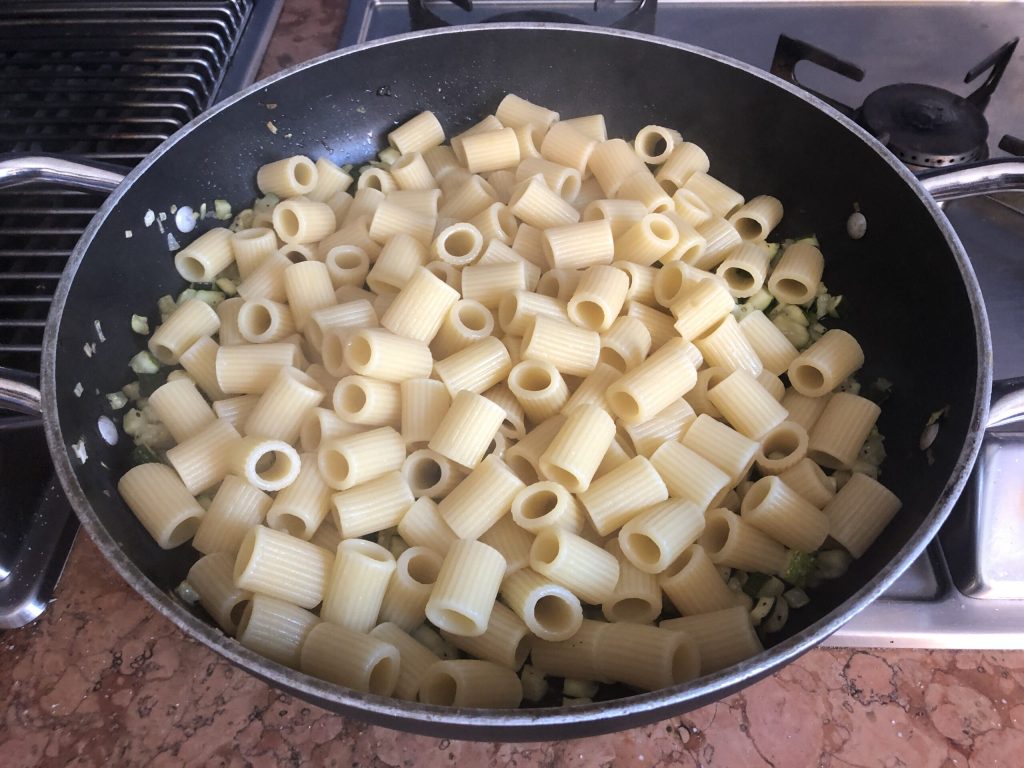 • Die Pasta in reichlich gesalzenem kochendem Wasser al dente kochen; abtropfen lassen, etwas Kochwasser aufbewahren und in den Topf mit den Zucchini geben.
