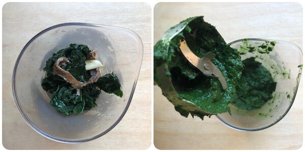 Nachdem ihr sie leicht ausgedrückt habt, in das Glas eines Stabmixers geben. Zwei Sardellenfilets, eine halbe Knoblauchzehe, geschält und von der inneren Seele befreit, einen Esslöffel Öl hinzufügen und mixen, bis eine perfekt glatte Creme entsteht. Mit Salz und Pfeffer würzen und beiseite stellen.