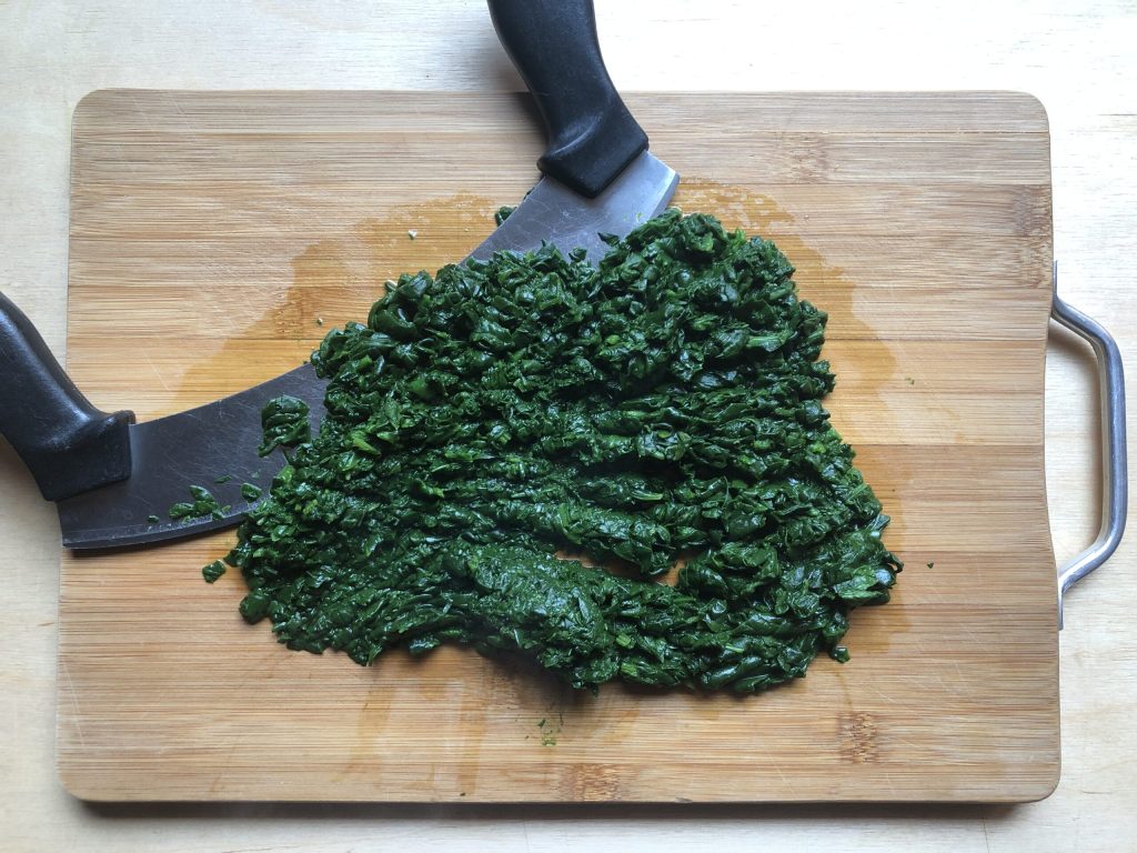 • Dann die Hitze ausschalten, abtropfen lassen, auf ein Schneidebrett legen und hacken: ich habe ein Wiege-Messer verwendet.