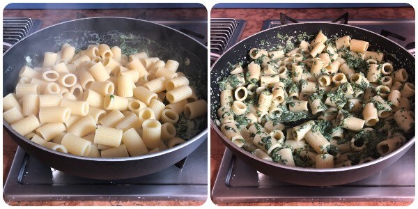 • Den Frischkäse zum Spinat geben und das Dressing mit etwas Kochwasser der Pasta verdünnen, es schrittweise hinzufügen, bis eine Creme entsteht. Den Knoblauch entfernen und, wenn nötig, salzen.
