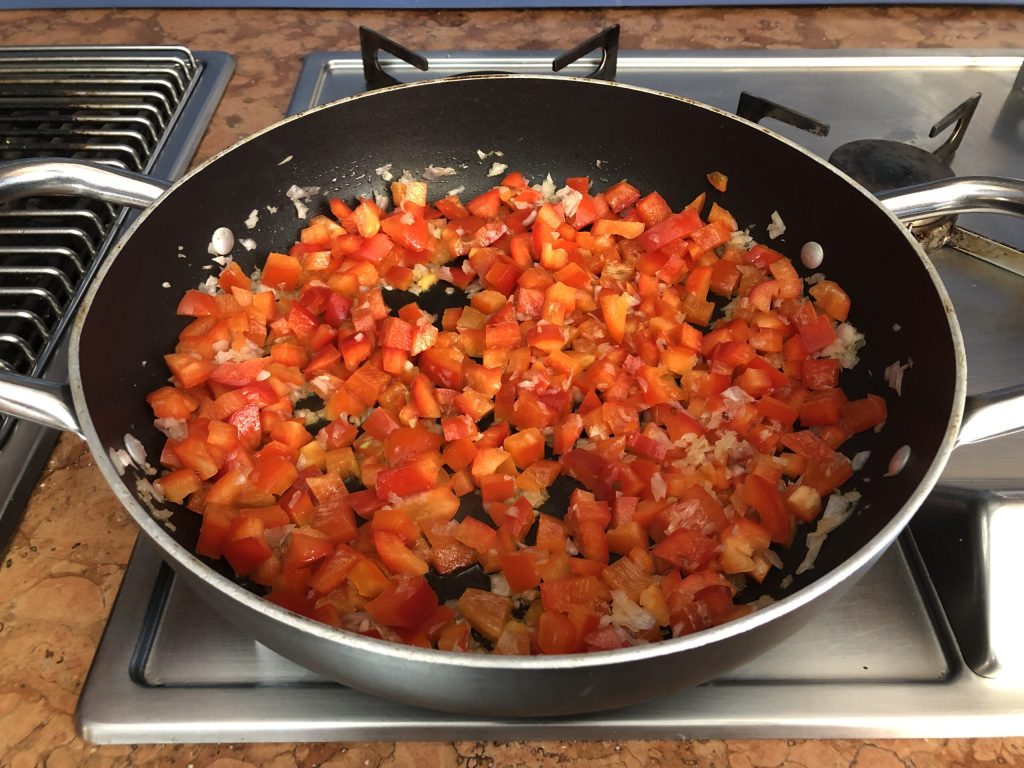 Einige Momente brutzeln lassen, dann die Paprika in die Pfanne geben und etwa zehn Minuten weitergaren, dabei häufig umrühren.