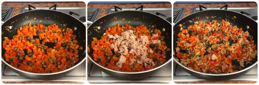 Nach dieser Zeit die entsalzten Kapern, die Taggiasca-Oliven und den gut abgetropften Thunfisch aus dem Erhaltungsöl hinzufügen. Nach Geschmack salzen und pfeffern. Ich verwende immer viel schwarzen Pfeffer, weil ich ihn sehr mag.