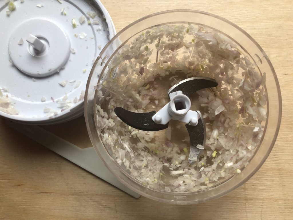 Die Schalotte fein hacken. Ich habe einen manuellen Seil-Zerkleinerer verwendet, den ich wirklich sehr praktisch finde. Wenn Sie ihn kaufen möchten, können Sie HIER klicken.