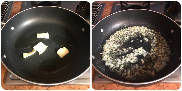 Wenn die Butter geschmolzen ist, die fein gehackte Zwiebel hinzufügen.