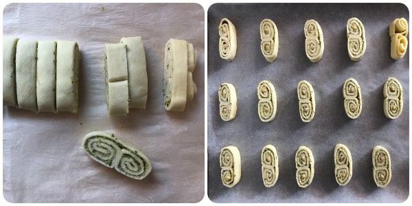 Zum Zeitpunkt des Backens die Rolle in etwa 1,5 cm dicke Scheiben schneiden und diese nach und nach auf das mit Backpapier ausgelegte Blech legen, dabei etwas Abstand zwischen ihnen lassen, da sie beim Backen aufgehen. Einige Pinienkerne auf die Wirbel legen.