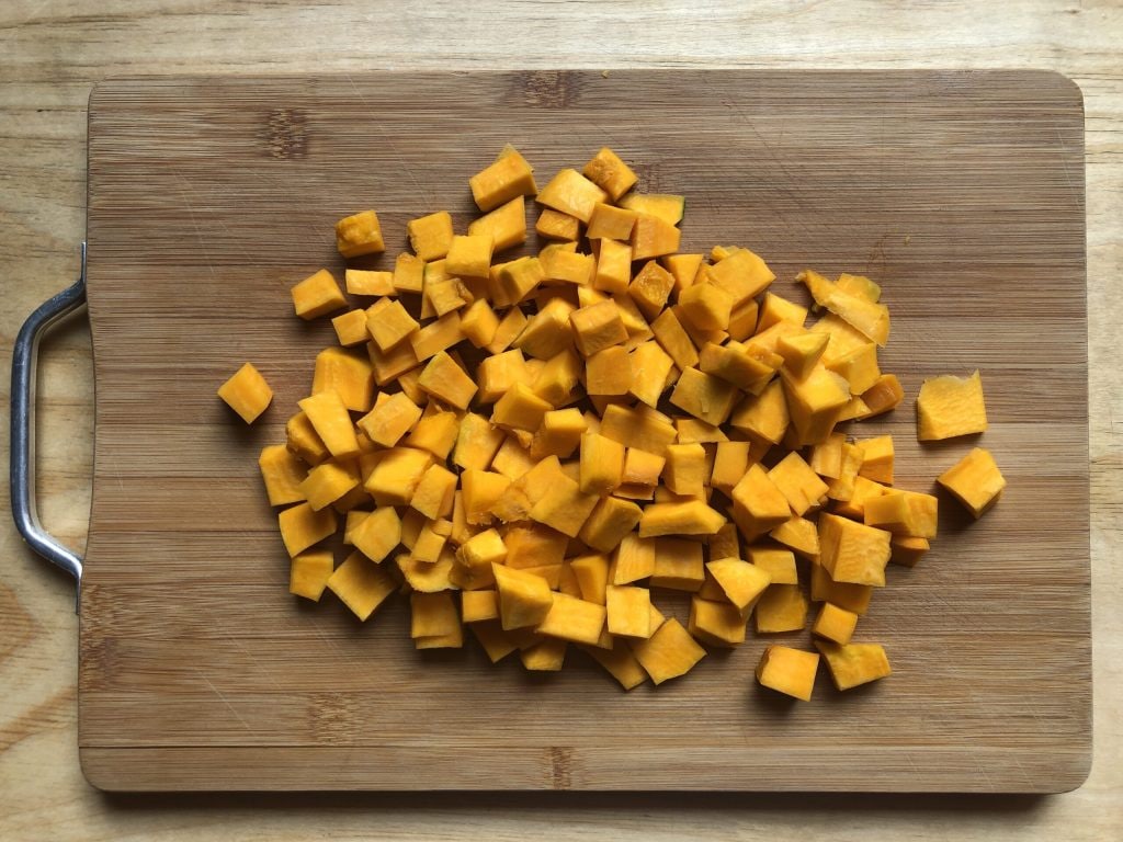 • Den Kürbis von der Schale, den Kernen und dem inneren Gewebe befreien und in Stücke schneiden.