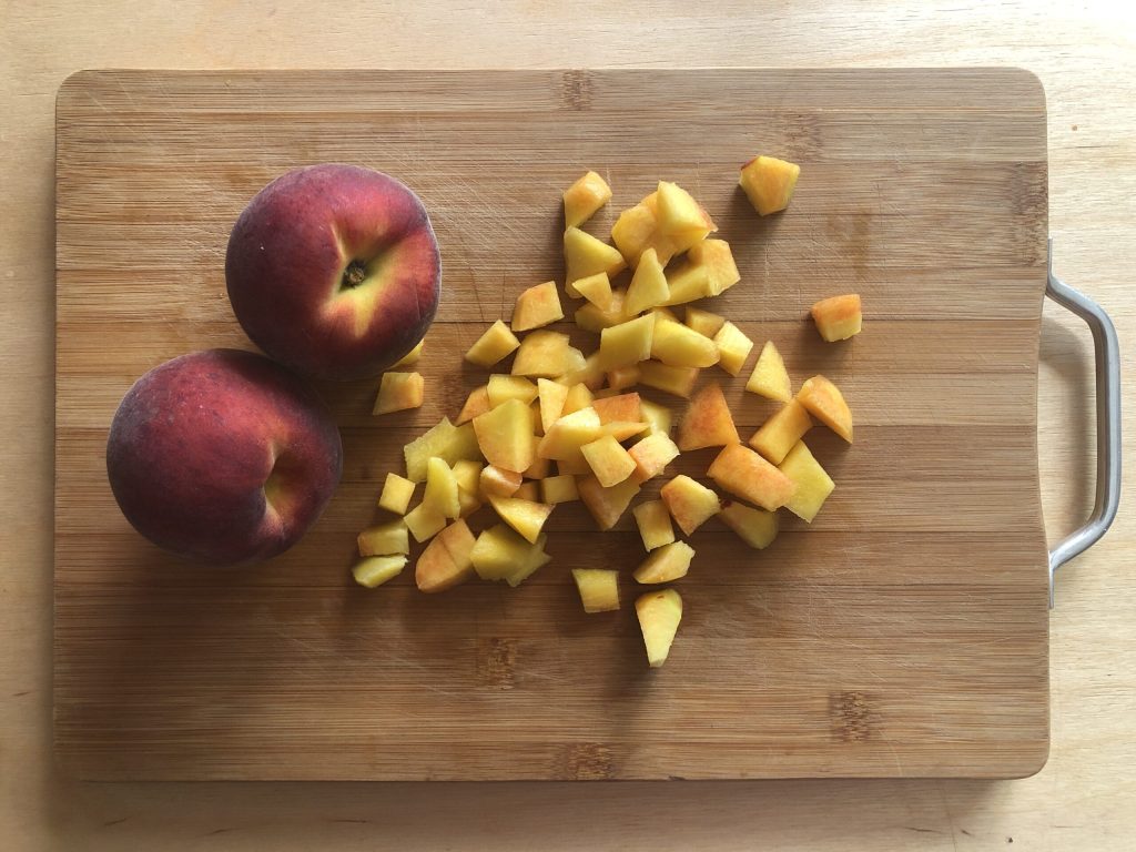 Pfirsiche waschen, schälen und in Würfel schneiden.