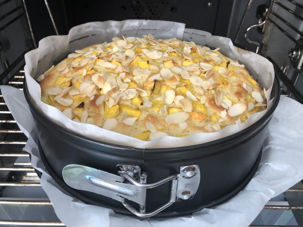 Den Teig in eine Springform mit einem Durchmesser von 22/24 cm geben, die restlichen Pfirsichstücke darauf verteilen und dann die Mandelblättchen hinzufügen.