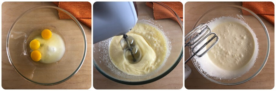 In einer großen Schüssel Zucker und Eier geben und mit dem elektrischen Handrührgerät lange schlagen, bis die Masse hell und schaumig ist.