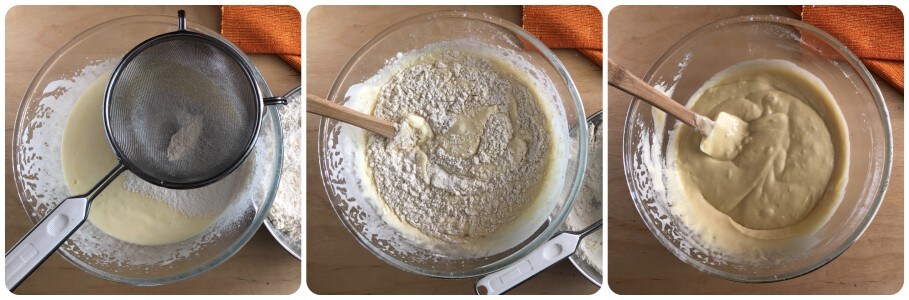 Nun nach und nach das Mehl zusammen mit dem Backpulver durch ein feinmaschiges Sieb sieben und sorgfältig mit einem Spatel unterheben.
