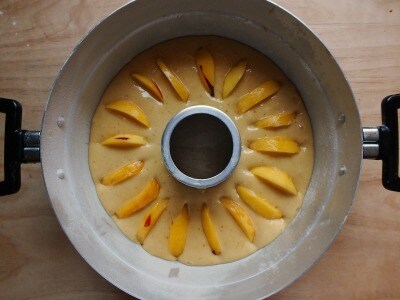 Den erhaltenen Teig in eine zuvor eingefettete und bemehlte Versilia-Backform mit einem Durchmesser von 24/26 cm gießen oder in eine Kranzform derselben Größe und die Pfirsichscheiben auf der Oberfläche anordnen. Wenn Sie diese Form kaufen möchten, können Sie sie online finden, indem Sie HIER klicken.