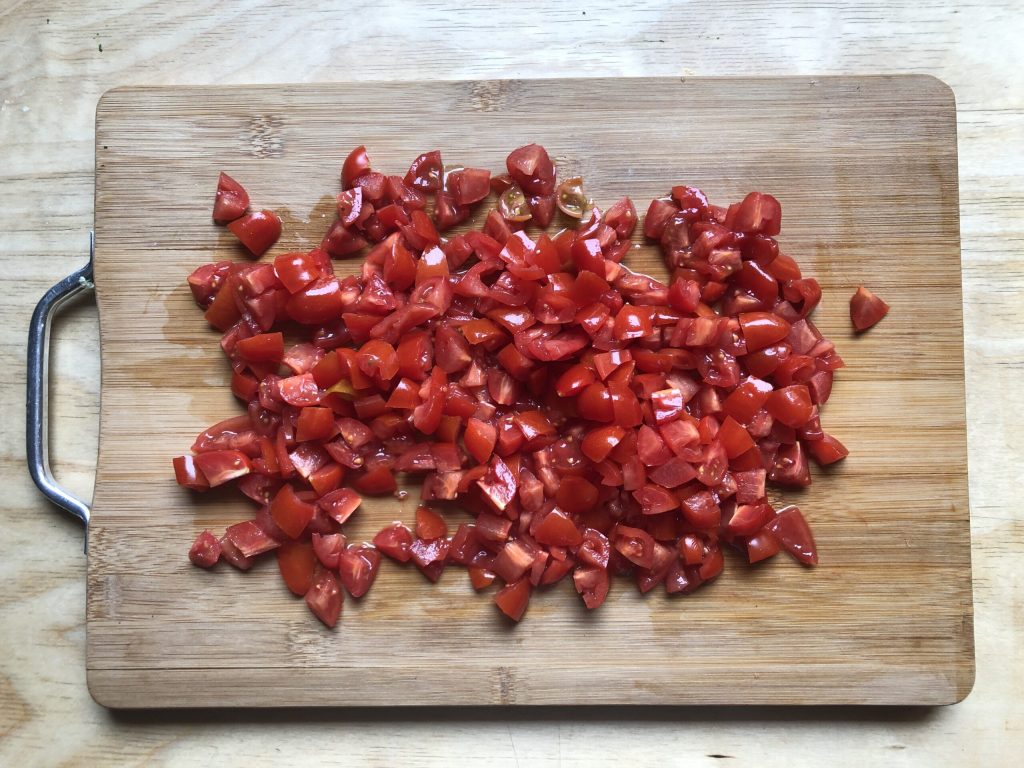 • Die Kirschtomaten waschen, mit Küchenpapier abtupfen und in Stücke schneiden, dabei die meisten Kerne entfernen.