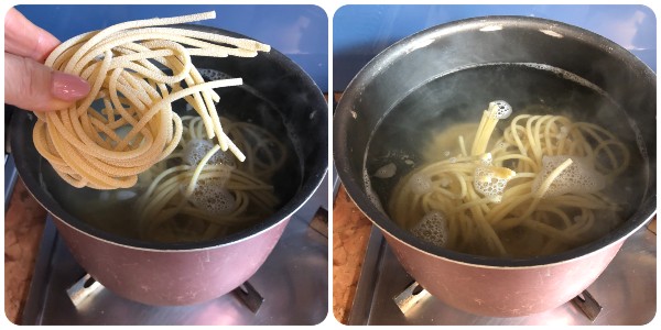 • In der Zwischenzeit die Pici in reichlich gesalzenem, kochendem Wasser kochen. Sobald sie im Wasser sind, nicht die ersten 7/8 Minuten umrühren, um zu verhindern, dass sie brechen. Die Gesamtkochzeit beträgt etwa 15/20 Minuten, überprüfen Sie dies jedoch auf der Verpackung.