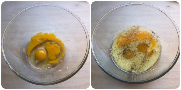 In einer großen Schüssel die Eier aufschlagen, dann das Öl, die Milch, eine großzügige Prise Salz und eine Prise schwarzer Pfeffer hinzufügen.