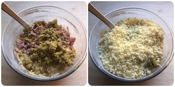 Sobald das Mehl vollständig in die Masse eingearbeitet ist, die Schinkenwürfel, die zerkleinerten Oliven und den Emmentaler sowie den geriebenen Käse hinzufügen.