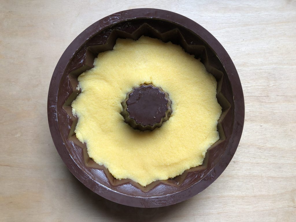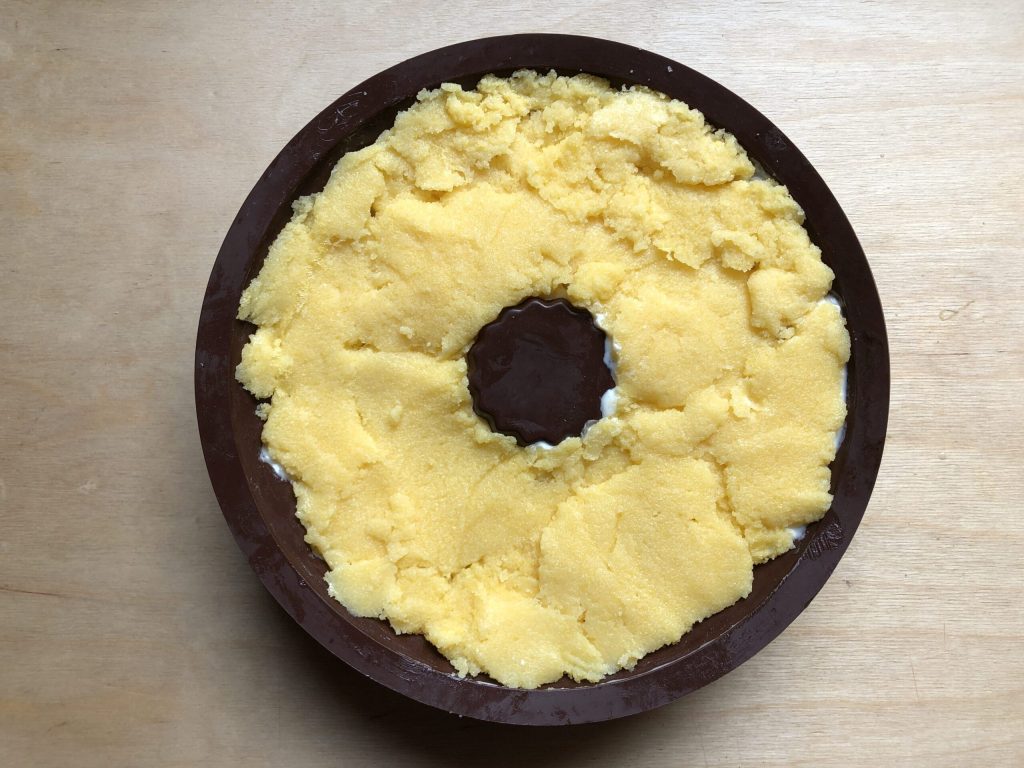 An diesem Punkt die Hälfte der Polenta in eine zuvor gebutterte Kranzform mit einem Durchmesser von 24 cm gießen.