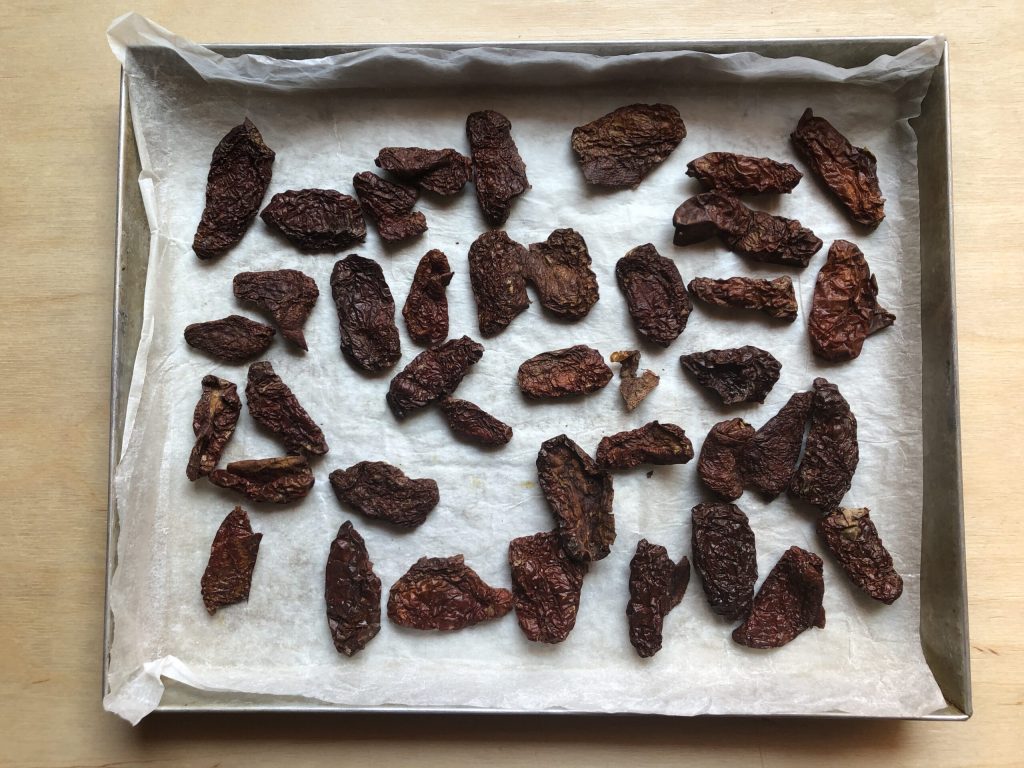 Die getrockneten Tomaten ohne Überlappung auf ein mit Backpapier ausgelegtes Blech legen.