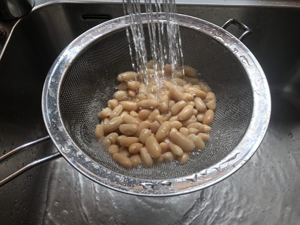 • Die Cannellini-Bohnen aus ihrem Konservierungssaft abtropfen lassen und gründlich unter kaltem fließendem Wasser abspülen.