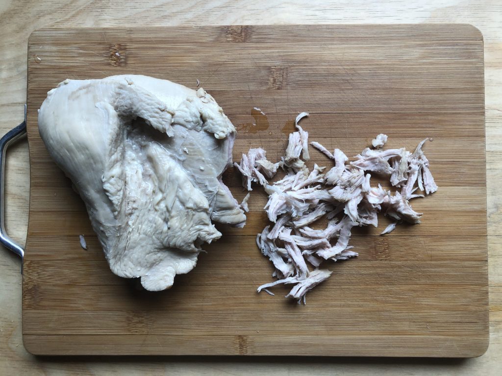 • Wenn die Pute abgekühlt ist, aus der Flüssigkeit nehmen und mit den Händen zerkleinern.