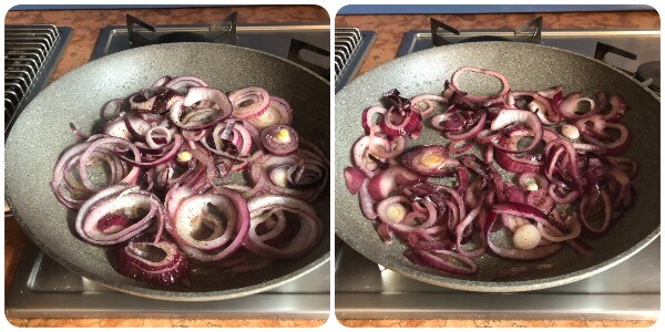 In einer Pfanne ein paar Esslöffel Öl und einen Esslöffel Wasser erhitzen, bevor Sie die Zwiebelringe hinzufügen. Nach Belieben salzen und pfeffern und bei mittlerer bis niedriger Hitze 8/10 Minuten leicht anbraten, dabei gelegentlich umrühren.