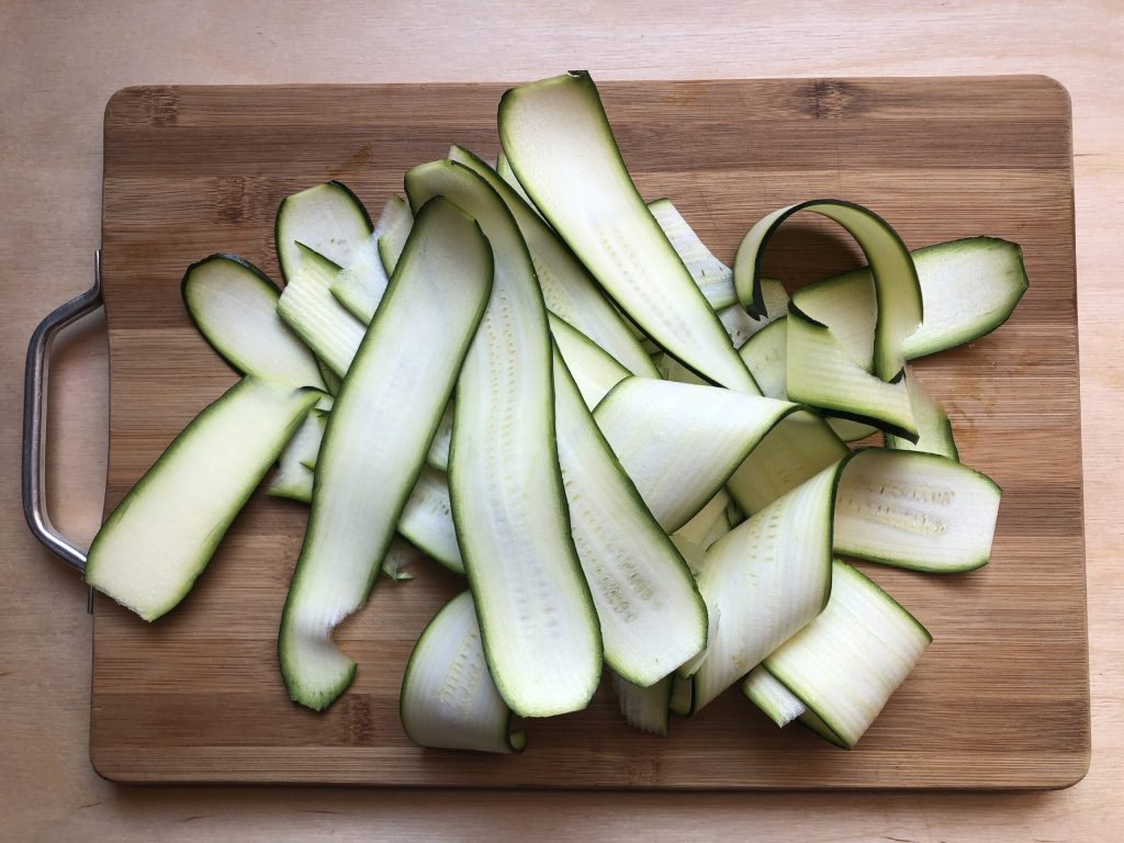 Die Zucchini abspitzen, waschen und mit einer Mandoline der Länge nach in dünne Scheiben schneiden.