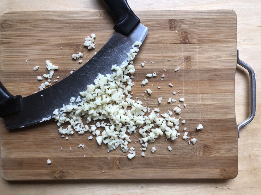 Die Zwiebel schälen und fein hacken. Ich habe einen manuellen Zerkleinerer mit Zugkordel benutzt, den ich wirklich sehr praktisch finde. Wenn Sie ihn kaufen möchten, können Sie ihn HIER finden.