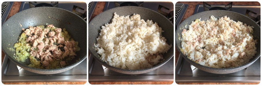 Wenn die Zwiebel weich geworden ist, den gut abgetropften und zerkleinerten Thunfisch hinzufügen. Dann auch den Reis hinzufügen und kurz umrühren.