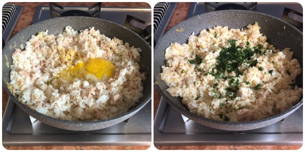 An dieser Stelle das ganze Ei und das Eigelb, ein paar großzügige Prisen Salz, eine große Menge frisch gemahlenen schwarzen Pfeffer hinzufügen und alle Zutaten gut miteinander vermischen. Schließlich mit gehackter Petersilie würzen.