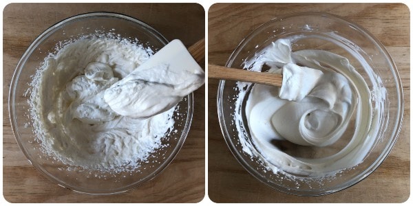 Dann die geschlagene Sahne zur Ricottamischung geben und vorsichtig von unten nach oben einarbeiten, um die Masse nicht zu entlüften.