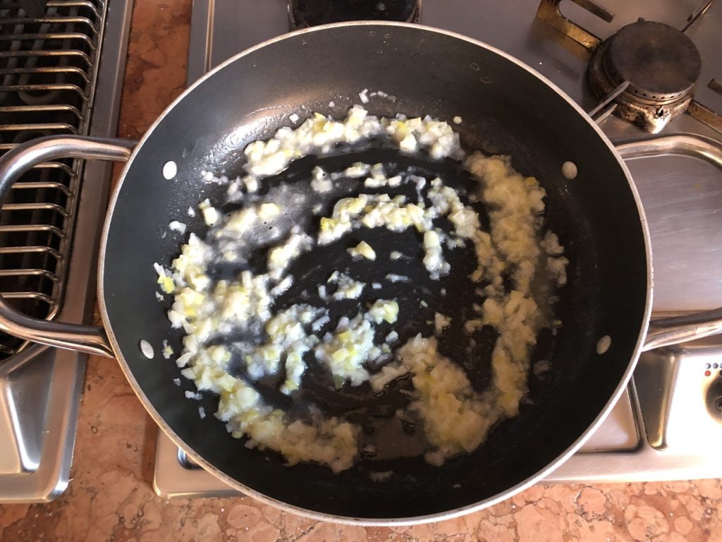 Den Lauch putzen, die Wurzeln, die äußere Schale und den dunkleren grünen Teil entfernen; dann fein mit einem Wiegemesser hacken und in Butter in einem großen Topf anbraten.
