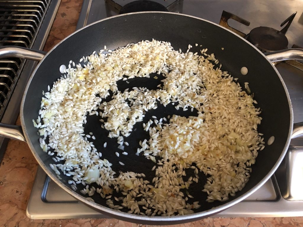 Wenn der Lauch leicht weich geworden ist, den Reis hinzufügen und ein paar Minuten lang unter Rühren mit einem Holzlöffel anrösten.