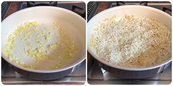 In einer großen Pfanne einige Esslöffel Öl erhitzen und die fein gehackte Frühlingszwiebel darin anbraten. Den Reis hinzufügen und ein paar Minuten anrösten, dann mit dem Weißwein ablöschen und verdampfen lassen.