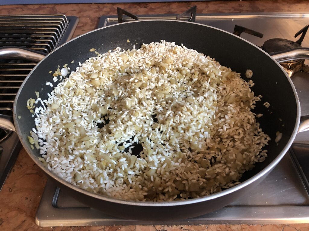• Die Topinambur ein paar Minuten unter ständigem Rühren anbraten, dann den Reis hinzufügen und eine Minute lang rösten lassen.