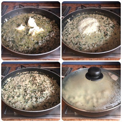 Nach einigen Minuten auch den Spinat hinzufügen und mit der Zubereitung fortfahren, indem Sie bei Bedarf weitere Brühe hinzufügen.