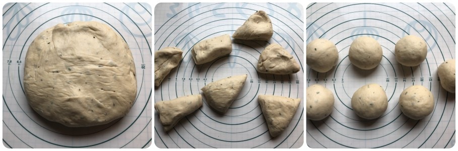 Am Ende dieser ersten Gehzeit den Teig auf die Arbeitsfläche geben und in sieben Stücke von jeweils etwa 70 g teilen. Sieben Kugeln formen.