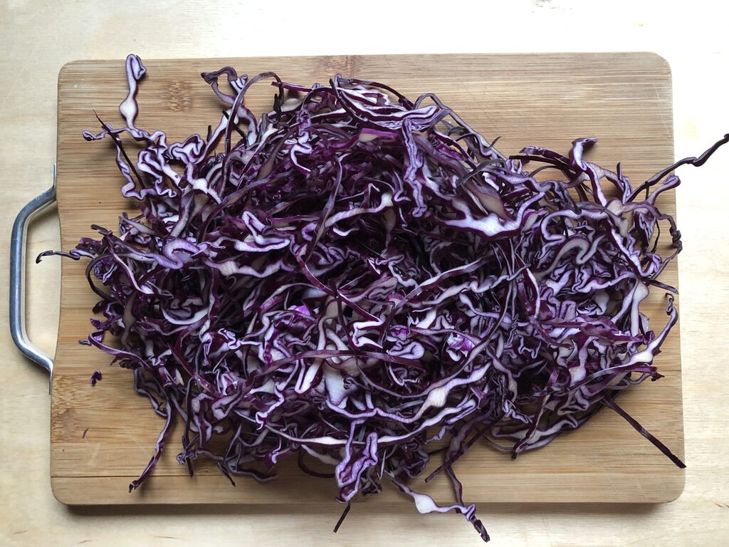 • Die äußeren Blätter des Rotkohls entfernen, gründlich unter fließendem Wasser waschen, mit Küchenpapier trocken tupfen und in feine Streifen schneiden. Für die Bequemlichkeit habe ich den Allesschneider benutzt, aber man kann es problemlos auch mit einem Messer machen.