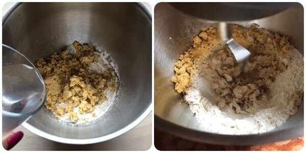 Die Kichererbsen zum Mehl hinzufügen, das lauwarme Wasser dazugeben und mit dem Knethaken kneten.
