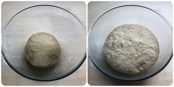 In eine geölte Schüssel geben, den Teig ebenfalls einölen, mit Frischhaltefolie abdecken und an einem warmen Ort ohne Zugluft auf das Doppelte seines Volumens aufgehen lassen: Die Gehzeit hängt stark von der Umgebungstemperatur ab und kann zwischen zwei und drei Stunden variieren.