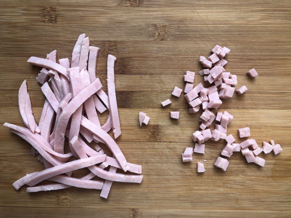 Den Schinken von eventuell fetten Teilen befreien und zuerst in Streifen, dann in kleine Würfel schneiden.