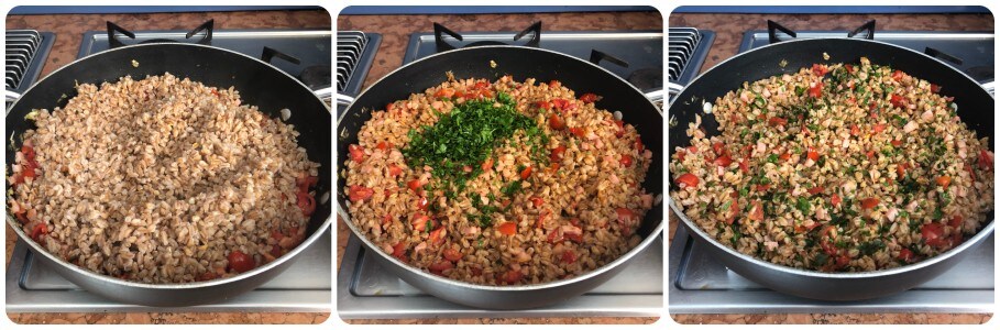 An diesem Punkt den Dinkel in die Pfanne mit der Soße geben und ein paar Minuten auf dem Herd ziehen lassen.