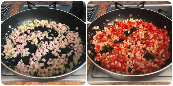 Dann die Schinkenwürfel hinzufügen und 2/3 Minuten bei hoher Hitze anbraten, bevor auch die Kirschtomaten hinzugefügt werden. Weiterkochen, dabei gelegentlich umrühren. Mit Salz und Pfeffer nach Belieben würzen.