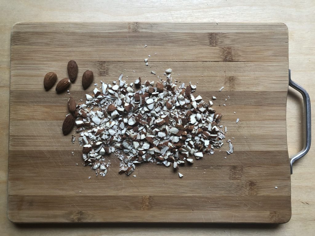 Die Mandeln grob mit einem Messer hacken. Das Rösten ist nicht nötig, das übernimmt der Ofen.