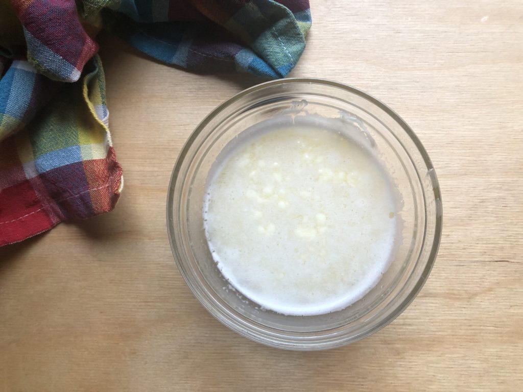 Die Butter in Stücke schneiden und im Wasserbad oder in der Mikrowelle schmelzen; dann etwas abkühlen lassen.