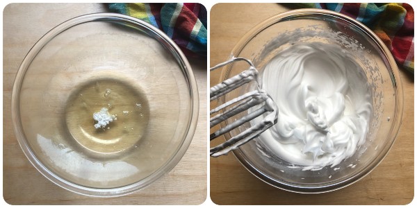 Eine Prise Cremor Tartar zum Eiweiß geben und mit dem Handrührgerät beginnen, es aufzuschlagen, dabei nach und nach 30 g Zucker aus der Gesamtmenge zuzugeben. Das Eiweiß ist fertig, wenn sich weiche, aber stabile Spitzen bilden. Beiseitestellen.
